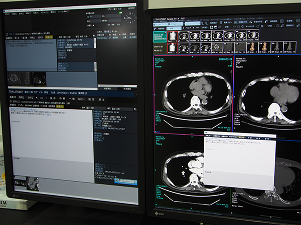 Reportでは,液晶モニタを縦置きにした表示(ポートレートモード)を推奨しているが,新たな表示レイアウト(バーティカルモード)として,前回と今回の所見を上下に分割して並べて,検査リストやキー画像の表示エリアを広げるなどの機能を強化している。今回の展示では,そのバーティカルモードのすべての機能が,液晶ワイドモニタ横置きスタイルでも利用できるようになった。働き方改革やCOVID-19感染対策でリモート業務が求められる中で,自宅などの端末から利用することが増えたことから,一般的なモニタの設置スタイル(横置き)でもバーティカルモードの機能を利用したいという要望に対応したものだ。
