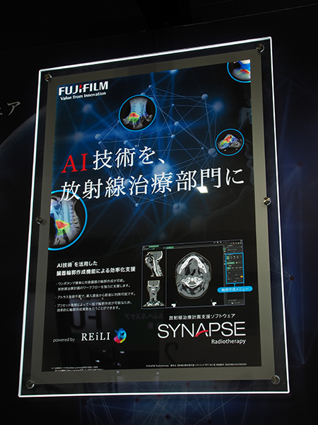 展示では,2021年2月に発表された富士フイルムが開発し同社が販売する放射線治療計画支援ソフトウエア「SYNAPSE Radiotherapy」を初展示。そのほか,富士フイルム医療ソリューションズの画像診断ワークステーション「ShadeQuest/ViewR-DG」,所見レポート作成システム「ShadeQuest/Report」などについて,富士フイルムの人工知能(AI)技術を搭載したAIプラットフォーム「SYNAPSE SAI viewer」や3D解析アプリケーション「SYNAPSE VINCENT」との連携強化を進めたことをアピール。また,被ばく線量管理システム「ShadeQuest/DoseMonitor」の新機能についても紹介した。