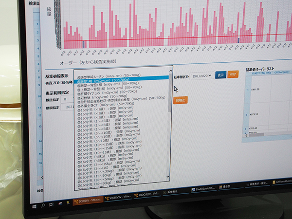富士フイルム医療ソリューションズのShadeQuest/DoseMonitor(DoseMonitor)は,同社のPACS,RISとの密接な連携によって適正な撮影と最適な線量での撮影を支援する被ばく線量管理システムである。CT,血管撮影装置,核医学に加え,新たに一般撮影装置,マンモグラフィ装置,X線透視装置を管理対象に加えた。線量情報の取り込みは,PACS(ShadeQuest/Serv)を介したRDSR情報やDICOM画像タグ情報からの取り込み,RISとの連携による各種情報の取り込みなど,施設の装置の対応状況やシステム環境に合わせた構築が可能になっている。また,線量管理の支援機能では,患者単位,検査プロトコール単位の画面で,患者プロファイル情報や検査プロトコール名称などで検索して情報を確認できる。撮影プロトコールごとの線量を診断参考レベル(DRLs 2020)とのグラフによる比較や,アラート,箱ひげ図などでの表示が可能になっている。