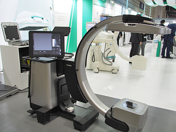 外科用Cアーム型デジタル透視システム「COREVISION」シリーズは,X線の静止画像で培ってきた画像処理技術を生かした高鮮鋭で高コントラストの動画像が高い評価を受けている。今回のITEMブースでは,その次世代の製品として“動画カセッテDR搭載X線透視診断装置”を医薬品医療機器等法未承認品として参考展示した。操作コンソールやフットスイッチなどの接続をすべてワイヤレス化し,本体のコード類もすべて装置内に収めて手術室や清潔環境での使用を前提に設計を行った。異なるサイズの動画カセッテDRを交換して使用できるなど,新技術を前提とした新しいCアーム装置の形を提案していた。