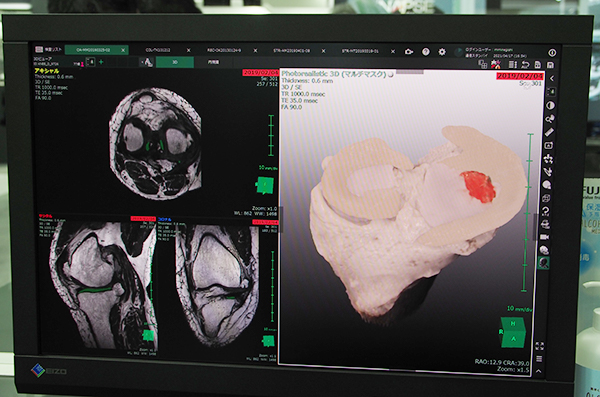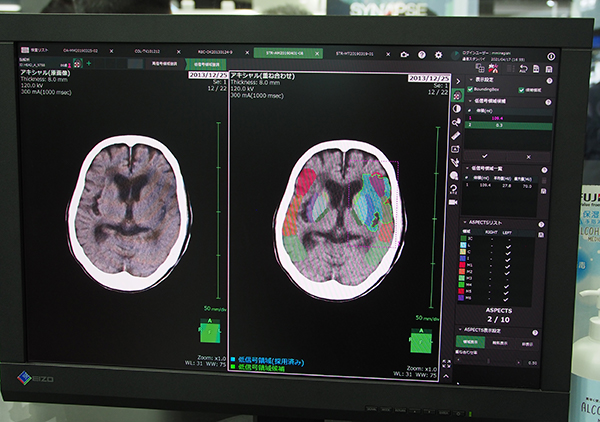 ヘルスケアITでは,3D画像解析システム「SYNAPSE VINCENT」の新しいアプリケーションとして“脳解析”ソフトウエアと,“フォトリアリスティック・レンダリング”を紹介した。脳解析ソフトウエアでは,頭部CT画像の高信号領域と低信号領域を認識して色づけして強調表示する。また,低信号領域の結果をスコアリングして,虚血領域の広がりを定量化するためのスコア法である“ASPECTS”の算出を支援する機能を搭載する。また,フォトリアリスティック・レンダリングでは,GPUを使うことなくよりリアルな3D表示を可能にする。
