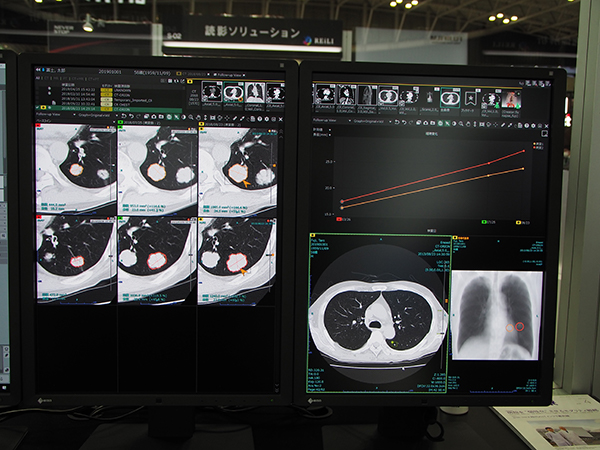 AIプラットフォーム「SYNAPSE SAI viewer」では,新機能の“フォローアップビュー”機能を紹介した。過去の画像所見との比較読影を支援する機能で,過去画像とのスライスの位置合わせ,拡大率の調整などを自動で行い,病変一覧,グラフ表示,CTから作成したレイサム画像での病変位置表示などを行う。AI技術を応用して読影医の業務を支援する機能だ。