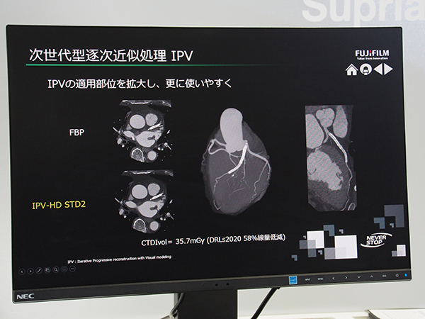 CTは,64列128スライスCT「SCENARIA View」が新バージョン「phase 3」にアップデートしたことをアピールした。展示されたモックアップは,社名変更に伴って,寝台マットやガントリ脚部のカラーが,シックな富士フイルムカラーに変更された。SCENARIA Viewは,逐次近似処理技術“IPV(Iterative Progressive reconstruction with Visual modeling)”による「低線量と高画質の両立」,高速化・自動化のソリューション“SynergyDrive”による「検査効率の改善」,80cm開口径と横スライド寝台による「快適な検査」をコンセプトに開発された装置。今回リリースされたphase 3は,新設計のフルデジタル検出器の搭載により,「SCENARIA」と比べて電気ノイズの最大40%低減,消費電力の45%低減(Off-time mode機能で最大78%低減),信頼性の向上と30%の軽量化を実現している。また,IPVが進化し,新たに心臓にも適用可能になった。冠動脈CT へのIPV適用により,診断参考レベル(DRLs 2020)の半分程度の線量でも明瞭な画像を得ることができる。心臓CTにおいては,自由度の高い心電図同期連動AECである“IntelliEC Cardiac”や,寝台の横スライドと小視野用Bow-tieフィルタを組み合わせた“IntelliCenter”を併用することで,さらなる被ばくの低減と画質向上を図ることができる。