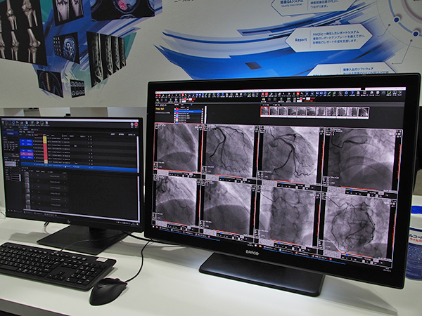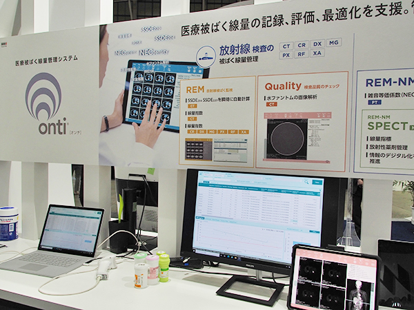 “温故知新”からネーミングされた医療被ばく線量管理システムのontiは,線量の記録だけでなく蓄積されたデータに基づいた線量の評価から最適化までを支援する。CTや各種X線装置(CR,透視撮影装置,マンモグラフィ,パノラマ撮影装置,アンギオグラフィなど)に対応するのはもちろんだが,SPECTやPET-CTなど核医学検査の被ばく線量管理の機能が充実している。ontiは,国際標準規格(Integrating the Healthcare Enterprise:IHE)に準拠して,RDSR(放射線量構造化レポート),核医学分野でのRRDSR(放射線医薬品の放射線構造化レポート)に対応,REM(放射線被ばく監視)/REM-NM(核医学の放射線被ばく監視)のプロファイルに基づいたシステムの構築が行える。ブースでは,価格についても見直し,高機能が評価されて国立医療機関や大学病院での導入や機能評価が始まっていることをアピールした。