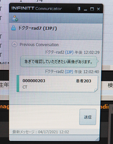 医療画像情報統合システム「INFINITT PACS」は,PACSを中心にレポートやRISなど,同社が提供するすべての製品のデータベースを統合する。2019年にリリースされた最新バージョン「INFINITT PACS 7.0」は,次世代のソリューションとして,処理スピードや読影ワークフローの向上を実現している。レポートの見逃し防止機能が追加されたほか,画像カンファメッセンジャー「INFINITT Communicator」で院外のスタッフにもメッセージや画像のリンクを送付,共有でき,チーム医療やリモートワークを促進する。