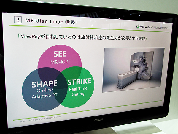 伊藤忠商事は,米国ViewRay社のMRリニアックシステム「MRIdian Linac」をPRした。MRIdian(メリディアン)は,MRIとリニアックを組み合わせて画像誘導放射線治療(IGRT)を可能にする治療装置で,現在,世界41施設で稼働している。国内では国立がんセンター中央病院(照射装置がコバルト60)と江戸川病院の2施設で稼働中だ。江戸川病院では,2021年1月にコバルト60からリニアックにアップグレードして国内初のMRIdian Linacの稼働が始まった。