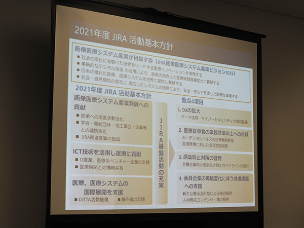 また,「第18回(2020年度)画像医療システム等の導入状況と安全確保状況に関する調査報告書」の調査結果が同日公開となり,その概要が報告された。その中で,装置の平均買い換え年数が高止まり傾向を示し,長期使用が固定化していることに加え,装置の保守管理の重要性が増す中で,院内点検を含む保守点検の実施対応が十分に進んでいない状況が明らかとなったことが示された。そのほかに,2012年の発刊から10年目を迎える「図表で見る画像医療システム産業 DataBook 2021」(JIRA刊行)の内容も紹介された。
