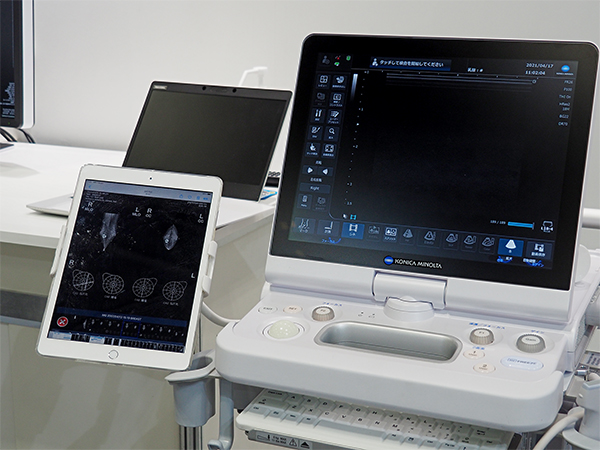 マンモグラフィ画像診断システム「FINO. VITA. PX type MG」。タブレットに表示されたエコーシェーマで病変位置を確認しながら超音波検査を行える