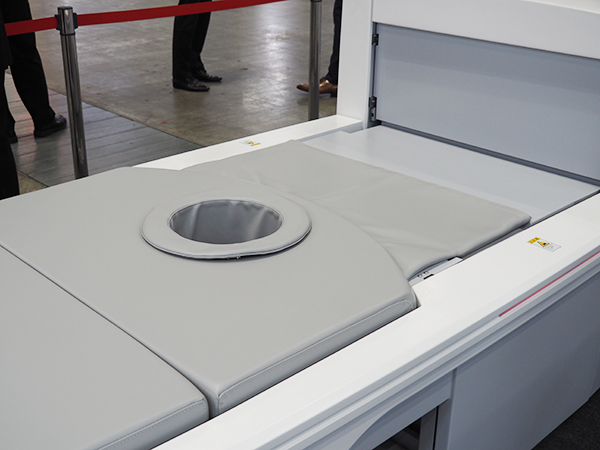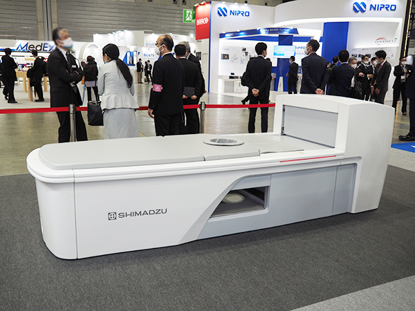 2021年3月に発売された頭部・乳房用の世界初のTOF-PET装置「BresTome」が初展示された。“Brain and Breast Tomography for rest”を体現する同装置は,高性能検出器を頭部撮像モードと乳房撮像モードに切り替えることで,頭部・乳房両方の検査が行える。島津製作所は長年にわたりPET装置の開発を行い,2014年には痛みを伴わず高精度の検査が可能な乳房専用PET装置「Elmammo」を発売している。今回のBresTomeは,それらの蓄積の上に,最新の半導体検出器やTOF(Time of Flight)技術により,全身PET装置では達成できない高解像度な画像を実現した。さらに,減弱補正にCT像を用いないことで,低被ばく化を実現したほか,水冷チラーが不要になったことでコンパクト化が可能となり,導入のハードルを低減した。