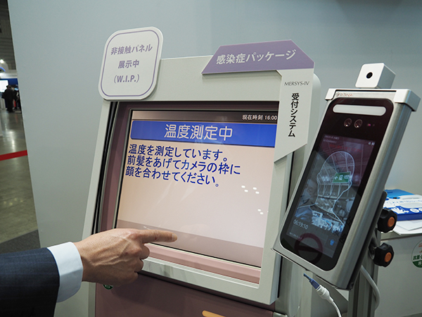新型コロナウイルス対策を施したクリニック向けシステムも展示された。2019年に島津エス・ディー(株)から販売業務を移管した問診受付システム「MERSYS-Ⅳ」は,大画面19インチの液晶タッチパネルモニタで画面が見やすく,音声ガイダンスでスムーズな受付を実現する。2020年6月に発売された「感染症パッケージ」は,来院患者が画面に表示される問診に回答すると,状態に応じて感染対策エリアまたは一般診療エリアへそれぞれ誘導される。医療スタッフとの接触を減らすことで感染リスクを低減するほか,画面への非接触パネルの装着や自動検温装置の併設により,来院患者に安心を提供する。