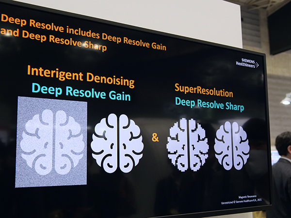 一方,MRIでは,ディープラーニングを用いた画像再構成技術“Deep Resolve”は,全身の撮像に対応。ノイズを低減してSNRの優れた画像を再構成する“Deep Resolve Gain”と低分解能画像を高分解能画像に再構成する“Deep Resolve Sharp”があり,両者を組み合わせた適用できる。
