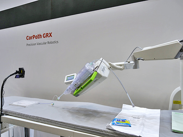 さらに,インターベンションの課題を解決するデジタル技術として,経皮的冠動脈形成術(PCI)におけるガイドワイヤやステントを遠隔で操作できるロボット「CorPath GRX」も展示された。手技の精度が向上するだけでなく,術者や患者の被ばく低減を図れる。