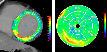 CT心筋ECV解析(左:心筋輪郭自動抽出,右:Bull’s eye map)