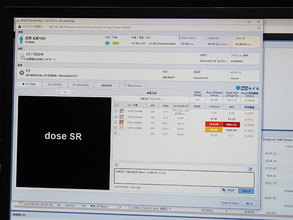 被ばく線量管理システム「INFINITT DoseM」。線量が超過したケースでは,下に理由も表示される。