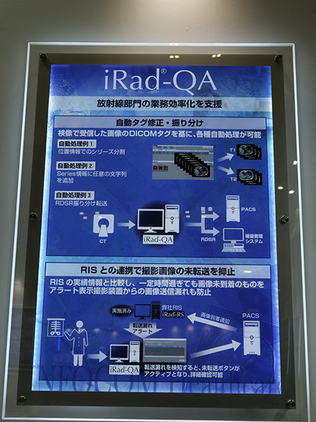 「iRad」シリーズを展開し,放射線部門のワークフローの効率化,医療安全に寄与してきたインフォコム。今回も検査から診断,放射線治療に至るまでの業務を支援するソリューションを紹介し,来場者の関心を引き寄せた。新型コロナウイルス感染症(COVID-19)の感染防止対策や,2020年度から始まった医療被ばくの線量管理・記録の義務化への対応など,放射線診療の現場が抱える課題に対して,長年積み上げてきた実績をベースに開発した新機能で答えを示した。ブース内では,前回のITEMで最新バージョンを発表した検像システム「iRad-QA」とRIS「iRad-RS」の連携による確実な検像業務支援のデモンストレーションを行った。また,iRad-RSは,インルームモニタやタブレットを用いた患者取り違え防止機能も紹介。さらに,参考展示として,iRad-RSの入力作業を音声入力にすることで,キーボードやマウスに触れる機会を減らし感染防止対策につなげる技術をアピールした。このほか,放射線治療用RISの「iRad-RT」は,多職種間での情報共有をスムーズに進めるための大型インルームモニタを用いた“マルチインフォメーションボード”機能を紹介していた。
