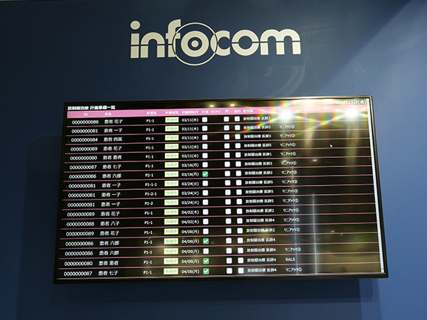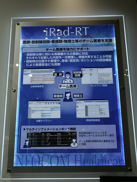 放射線治療用RISのiRad-RTに関しては,大型のインルームモニタを使用して治療のスケジュールや実施状況を表示するマルチインフォメーションボード機能を紹介した。スタッフ間の情報共有を容易にして,医師や診療放射線技師,医学物理士,看護師,事務員など多職種がかかわる放射線治療を高品質かつ安全に行えるようにする。チーム医療を支援するだけでなく,業務の省力化にもつながる。