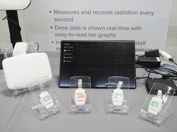 アンフォースレイセイフの個人被ばくリアルタイムモニターシステム「RaySafe i3」は,毎秒の個人線量当量率と累積個人線量当量を測定・記録し,測定データは無線で専用リアルタイムディスプレイに転送され,被ばく状況を確認できる。今回,新たに外部ディスプレイに出力可能なi3 OSD(On-Screen Display)も展示された。