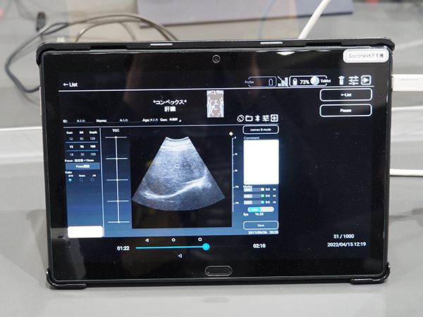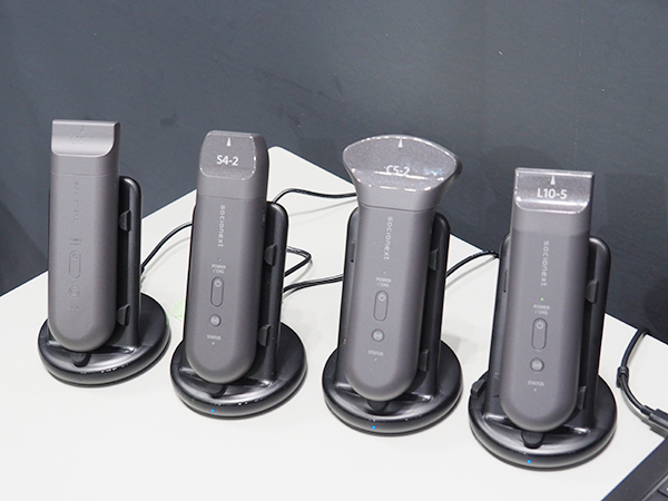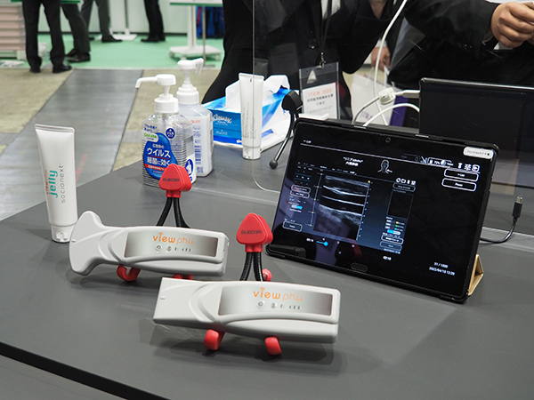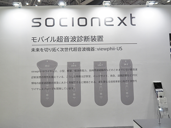 昨年に引き続き,ITEMには2回目の出展となるソシオネクストは,2020年1月に発売したワイヤレスハンドヘルド型超音波画像診断装置「viewphii-US」を展示した。ソシオネクストは,2015年に富士通の子会社である富士通セミコンダクターとパナソニックのシステムLSI事業の統合により設立され,SoC(System-on-Chip)の設計・開発,販売をグローバルに展開している。viewphii-USは,ソシオネクストが信号処理・画像処理用の半導体開発で長年蓄積した技術を,医療分野向けに応用した初のデバイスとなる。