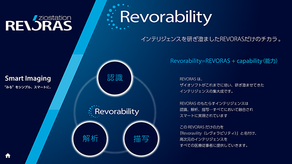 REVORASは,「Smart Imaging “みる”をシンプル,スマートに」をコンセプトとして開発され,臨床画像に関わる,あらゆる“みる”(診る,観る,看る)をよりシンプルかつスマートにする。そして,その高機能・高性能を支える独自の技術性能がRevorabilityである。Revorabilityは,「REVORAS+capability」を意味し,モダリティから得られる膨大な情報を最大限に生かし,「認識」「解析」「描写」に関わる高度な技術とアルゴリズムを融合し,画像処理の質を飛躍的に高める「REVORASだけの力」である。