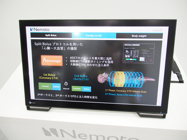 このほか,より安全な検査の実施に貢献する製品として,造影検査情報管理システム「CEエビデンスシステム」「圧力監視モニター」「造影剤モレ検知サポートシステムLD」(いずれもオプション)が紹介された。CEエビデンスシステムは,RISから取得した患者の副作用履歴や腎機能測定値など,造影剤注入前に確認すべき重要な情報を注入器のコンソールに表示することで,造影剤投与前の安全確認をサポートとするものである。検査後には,画像化した造影剤投与情報をPACSに送信することで,検査情報の一元管理も可能となる。今回の展示では,患者名の表記が,以前はカナとローマ字のみであったが,新たに漢字表記にも対応したことがアピールされた。
