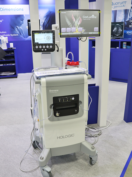 ホロジックジャパンは,従来から展開しているトモシンセシス対応のハイグレードモデルのデジタルマンモグラフィ「3Dimensions」やトモシンセシス読影をサポートするソフトウエア「3DQuorum」などに加え,新製品としてバイオプシーシステム「Brevera」を展示した。
