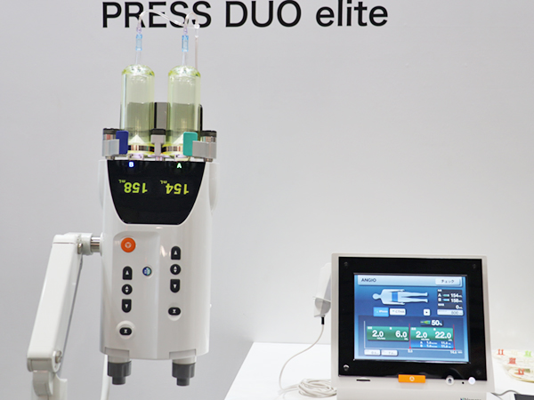 アンギオ用造影剤自動注入装置「PRESS DUO elite」は,造影剤と生理食塩水の同時注入が可能で,コントロールパネルの設定で任意の造影濃度での検査が可能になる。血管や腫瘍,ステントなどを,それぞれ適切な濃度で造影することで,視認性の高い画像を得ることができる。