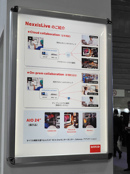 映像配信/画像統合ソリューション「Nexxis」による映像配信環境を再現した画像配信ソリューションコーナーでは,IVR室向けのワイヤレスソリューションや院外ライブ配信システム「Nexxis Live」のオンプレミス機能などが紹介された。Nexxisは非圧縮,広帯域10Gbps IPでノイズフリーで遅延のない画像を提供可能で,アンギオ/X線TV手術室向けソリューション「Nexxis IVR Solution」や操作室のワークフローを改善する「Nexxis WorkSpot」,Nexxis Liveなどを展開している。そのうちNexxis Liveは,リアルタイムにカテーテル室や手術室の映像や音声を双方向で外部配信することで,エキスパート医師による技術支援や医学生へのバーチャル講義などが行える。また,手術室内とリアルタイムで会話やチャット,画面のアノテーションによるコラボレーションが可能である。近年,日本での導入事例が増加しているが,従来のクラウド型に加え,新たにオンプレミス機能が追加されることが紹介された。これにより,院内回線を使用し,院内の離れた場所と画像や音声の共有が可能になる。また,Nexxis Live用24インチマルチタッチ・ユーザーインターフェイスも参考展示された。