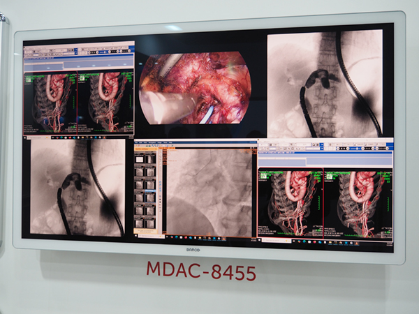 サージカルディスプレイコーナーでは,ITEM2024で紹介された55インチIVR用ディスプレイ(MDAC-8455)が参考展示された。同ディスプレイは,4Kの高輝度画質,高コントラストの次世代パネルで,保護ガラスの圧着にOptical Bonding技術を採用したことで映り込みを低減,明るい場所でも優れた視認性を維持できる上,ディスプレイ表面の清掃も容易に行える。また,広色域パネルにより内視鏡画像などの高い色再現性を実現する。そのほかに,43インチの新型ディスプレイも参考展示された。