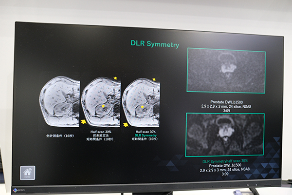 ソフトウエアでは,AI技術を活用して画質の向上や検査ワークフローの効率化をサポートするさまざまな機能が搭載された。画質の向上では,撮像時間の短縮のための手法としてデータの一部を計測せず未計測部分を推定データで補うハーフスキャンがあるが,撮像時間のトレードオフとして画像の劣化やアーチファクトが生じることがあった。DLR Symmetryは,AI技術を活用してk空間のデータを推定することで,短時間でも画質劣化の少ない画像が得ることが可能になる。そのほか,DLR Symmetryの適用部位として前立腺のDWIデータでも画質が改善していることを紹介した。また,ECHELON Synergy ZeroHeliumでは,AI技術を活用した被検者見守りシステム「Synergy Vision」が搭載されており,カメラでボア内を観察することで被検者の動きを探知したり,撮像終了後体動の影響がある信号を除去して画像再構成を行い体動アーチファクトを低減する「Visual StillShot」などが利用できる。そのほか,後処理でさまざまなアーチファクトの低減や画質のコントロールができる「IQ Retouch」などの機能を紹介した。検査ワークフローの効率化では,受信コイルのセッティングから,被検者のポジショニング,撮像の際のスライスラインの設定(AutoPose),撮像したデータに対する画像処理(AutoClip,AutoMPR)まで,AI技術を使ってさまざまなサポートができることをアピールした。これらの機能は,最新のバージョン11としてECHELON Synergy ZeroHeliumだけでなく,「ECHELON Synergy」「ECHELON Smart Plus」でも利用可能となる(発売は2025年6月)。