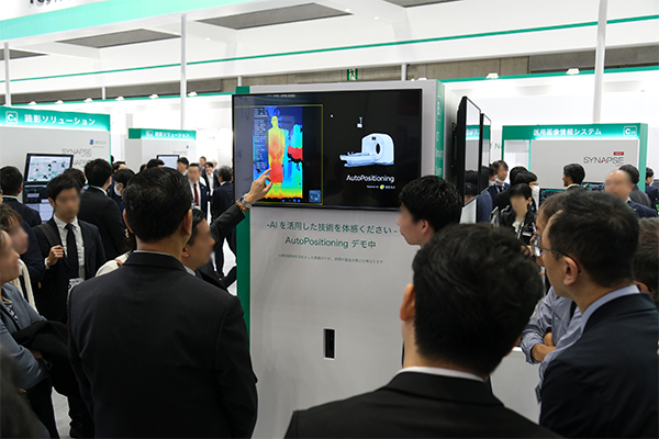 展示では,昨年のITEM2024で登場し大きな話題を集めた液体ヘリウムゼロのMRIのラインアップに加わった70cm大開口径磁石を搭載した「ECHELON Synergy ZeroHelium」が来場者の注目を集めた。同社では,「ゼロヘリウムMRI技術」のTVCM「世界は,ひとつずつ変えることができる」を3月から放映しているが,今回のITEM期間中,パシフィコ横浜の最寄り駅である横浜高速鉄道みなとみらい駅構内にゼロヘリウムMRI技術の大型のフラッグ広告掲示し,来場者のみならず一般市民に向けたPRを行った。そのほか,AIカメラを搭載した64列128スライスCT「FCT iStream Plus」,移動型デジタルX線撮影装置「FUJIFILM DR CALNEO Go iQ」,AIプラットフォーム「SYNAPSE SAI viewer」,ビューワ一体型読影レポートシステム「SYNAPSE SAI Report」など多くの新製品が登場した。
