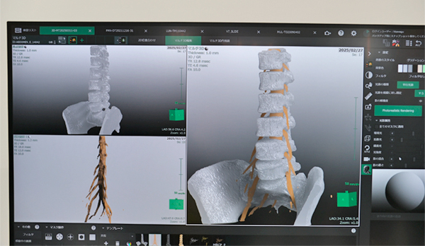 表現法の充実では,新レンダリング技術による奥行き感のある3D画像に加えて,画像変形機能や血管の結紮機能が新たに追加されリアルなシミュレーションが可能になった。肺野の変形シミュレーションでは,従来の脱気した状態のシミュレーションに加えて肺野を変形させることが可能になり,血管の状態を確認するなど実際の術野に近い観察が可能になった。また,血管の結紮のシミュレーションも可能で手術を支援する。AI技術を活用した画像解析機能では,CTの冠動脈領域,非造影肺動静脈分離の画像認識エンジンが改良され,冠動脈やバイパスの認識精度,非造影肺動静脈分離,脳動静脈分離などが改良され,新たに頭部MRAの区域分割,MRCPの胆管抽出などMRIの画像認識の機能が追加された。椎体のBone Imageの骨抽出では,椎体の抽出と腰椎の神経の抽出がワンボタンで可能で,CTデータを使わずにMRIから3D画像の作成が可能になる。空間再現ディスプレイとのコラボレーションでは,ソニー社製の27型大画面の「ELF-SR2」との連携をブースで紹介したが,従来の腹部領域に加えて新たに頭部領域に対応したことをアピールした。そのほか,最新バージョンではユーザーが設定した条件で撮影から画像作成までの実行が自動化できるほか,医療情報システムの安全管理に関するガイドラインに対応してパスワードの設定などセキュリティ対策が強化されているのが特長だ。