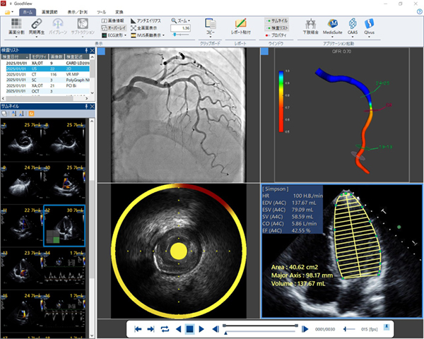 DICOMビューワ「GoodView」は主に循環器分野を対象とした画像の読影に特化した多機能ビューワです。直感的な操作で過去検査や他モダリティとの比較参照ができるのはもちろんのこと,エコー画像での容積や流速の計測,IVUS/OCT画像での長軸画像構築といった,読影を補助する機能を多数搭載しています。さらに臨床のみならず学会発表でもご活用いただけるmp4等へのファイルフォーマット変換も可能です。Goodnetの標準ビューワとしてだけでなくWindows対応単体プログラム「GoodViewPRO」としてもご提供できます。