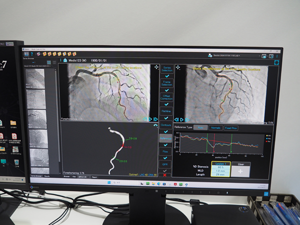 ブース内では,Medis QFRによる解析のハンズオンコーナーが設けられ,プレッシャーワイヤによる自施設の計測データを用いてMedis QFRによる解析との比較を体感できたほか,Medis QFRを導入した施設に対しては,匿名化した自施設データを基に適切な画像の選択や輪郭の修正,病変判定など,操作上のポイントについてアドバイスが受けられた。