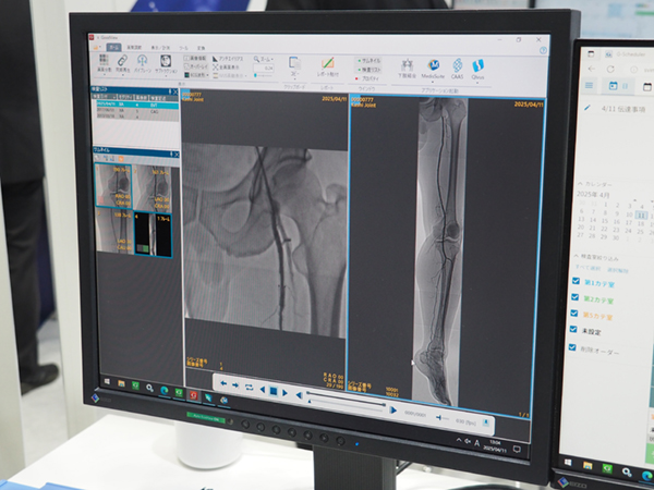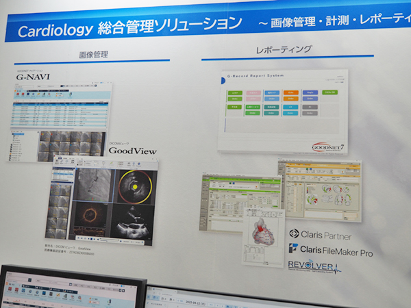 Cardiology総合管理ソリューションのGOODNETは,2000年の発売以降,国内350以上の施設で導入されている。最新バージョン「GOODNET 7」は使いやすさを追求したほか,医療現場の安全性や働き方の改善といったユーザーニーズの実現をめざし,新たな機能が開発・搭載されている。新たに搭載されたG-Schedulerはカテーテル室のスケジューリングシステムで,オンライン上でカテーテル室の予定を編集・管理できる。煩雑になりがちなカテーテル室のスケジューリングにおいて,無理のない予定管理や緊急対応の可否の確認などがカテーテル室外でも可能なほか,患者ごとの穿刺部位やアレルギー・感染症情報などを病棟看護師などの関係者が把握できる。また,DICOMビューワのGoodViewは画像閲覧だけではなく,IVUS,OCTの長軸画像構築や簡易計測,資料作成には欠かせない各種ファイルのフォーマット変換など,多彩な機能を搭載している。ブースでは,下肢のパンニングされた動画像から下肢長尺画像をワンクリックで自動構築する下肢結合機能が紹介された。
