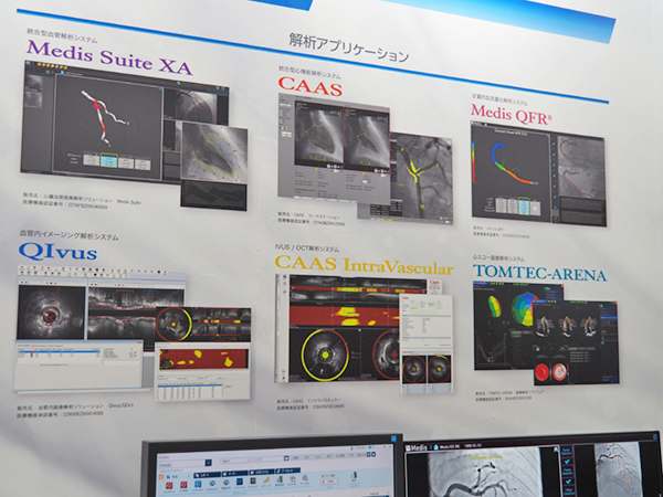 QCA,LVA解析などが可能な統合型血管解析システム「Medis Suite XA」,「CAAS」やIVUS,OCT解析にも対応する血管内イメージング解析システム「QIvus」などの解析アプリケーションのデモンストレーションも行われた。これらの解析アプリケーションはマルチベンダー対応で単体でも提供可能だが,GOODNETと連携することで解析結果データと元画像を一括で管理できる。カテーテルメーカーという特性を生かし,循環器領域でのオールインワンなソリューションを展開している。
