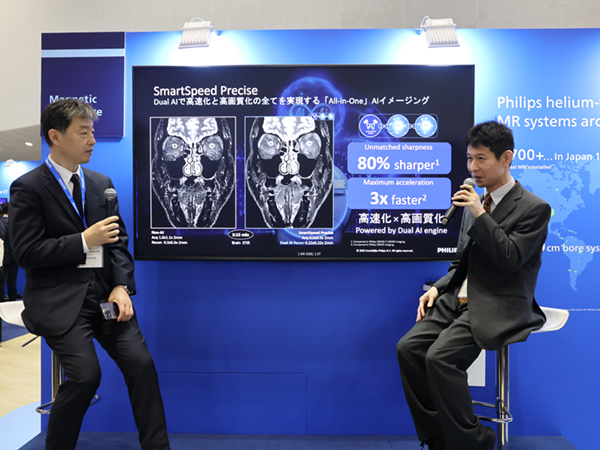 ITEM 2日目には,ブースでSmartSpeed Preciseの新製品発表会が行われた。発表会には,ゲストコメンテーターとして北海道大学の藤間憲幸氏が登壇し,SmartSpeed Preciseを臨床使用した経験を紹介した。藤間氏は,「SmartSpeed Preciseでは時間をかけて撮像したような自然な高分解能画像が得られ,より細かい構造が明瞭に見える。見えたままに読影をすればよいため読影の負担が軽減し,読影時間も短縮する。高精細化だけでなく高速化にも応用でき,日常臨床のほぼすべての場面で活用できるため広く普及することを期待している」と述べた。