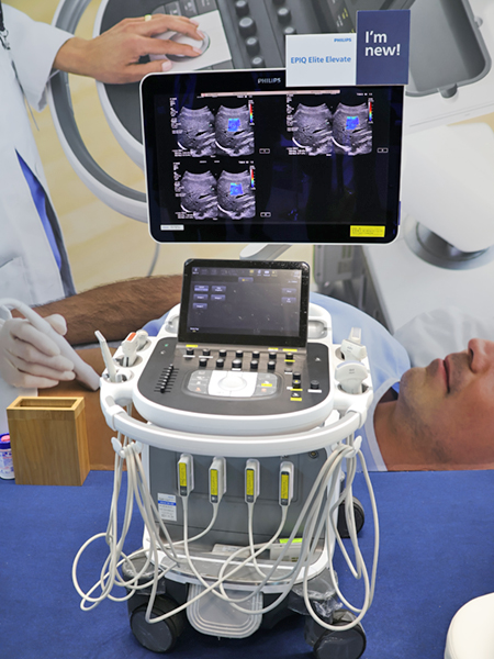 超音波診断装置は,4月1日に販売を開始した「EPIQ Elite/Affiniti」の最新バージョンとなる「Elevate」シリーズが実機を使ったデモンストレーションで紹介された。検査者に依存しやすい超音波検査の質を均質化・向上するための自動化機能や高度なアルゴリズムが搭載されている。自動画像調節ツール「AutoSCAN Assistant」は,ピクセル単位の最適化アルゴリズムや深さ方向の自動輝度調整により,手動調整の手間を減らし,患者ごとに最適化した画像をリアルタイムに描出する。また,肝臓エラストグラフィの「Auto ElastQ」は,従来はマニュアルで行っていたフレーム選択と,データの信頼度を表すConfidence Mapを見ながらのROI設定,計測を自動化。1つの動画から最適な3フレームが選択され,ROI設定,計測が自動で行われることで,検査者間のバラツキを抑え,検査時間を最大60%短縮する。