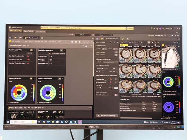 ヘルスケアITでは,これまで「IntelliSpace Portal」として提供してきたマルチモダリティ,マルチベンダーの画像診断ワークステーションを「Advanced visualization workspace」にリニューアルしたことをアピールし,心臓や頭部領域のアプリケーションを中心に紹介した。心臓MRI解析は「MR Cardiac Suite」へとアップデートされ,解析の労力と時間を大幅に削減し,ワークフロー改善を実現している。画像を受信するとバックグラウンドで輪郭が自動でトレースされ,抽出された輪郭は遅延造影解析やマッピング解析,Perfusion解析など,ほかの解析にも引き継がれる。MR Cardiac Suiteを開くと,過去画像も含めて患者の画像がビューワにすべて読み込まれ,患者の画像を1画面で確認できる。ビューワ機能は,多くの画像の中から必要な画像だけを選んで解析できる設計となっているほか,シネ画像だけなど見たい画像に絞って簡単にレイアウトすることができ,読影における利便性を向上する。さらに,循環器解析の結果を集約するファインディングダッシュボードも新設され,ワンストップで循環器診断を行える環境を提供する。
