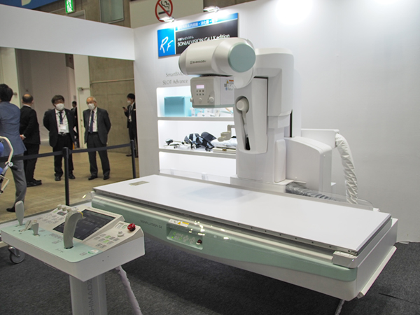 一般撮影システムは,昨年のITEMで発表された「RADspeed Pro SR5 Version」が紹介された。X線管懸垂器操作部のモニタには大型のタッチパネルモニタが採用されたほか,X線照射部に光学カメラを用いた撮影支援機能「VISION SUPPORT」(オプション)を搭載できる。被検者映像とX線の照射範囲を重ねてX線管懸垂器操作部のモニタと撮影コンソールのモニタの両方に表示可能で,操作室と検査室の双方で患者の状況を把握でき,正確なポジショニングを支援する。また,「パワーアシスト機能」やワイヤレスタイプのリモコンを用いた「オートポジショニング機能」などのオプション機能によって,スムーズなポジショニングが可能となる。