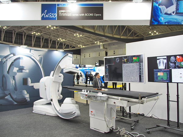 血管撮影システムは,「Trinias series with SCORE Opera」が展示され,昨年10月に発表された血管撮影システム向け音声認識機能「SMART Voice」がアピールされた。サブスクリプションサービス「SCORE Link」の一機能として追加搭載することができる。SMART Voiceを用いることで,血管系疾患の検査・治療手技中に術者の両手がふさがっている状況でも,治療で頻繁に利用される操作を音声で行うことができる。SMART Voiceは日本語と英語に対応しており,モニタ懸垂器に取り付けた専用マイクに向かって発声するだけで,13種類の機能を操作可能。タッチパネルやコントロールバーの操作のために手を使ったり,患部や画像モニタから視線を外す必要もないため,スムーズな検査・治療が可能となる。