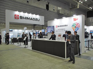 島津製作所は,1875年の創業から今年3月で150周年を迎えたとして,記念の年であることを大々的に打ち出すブースを展開した。壁面には,「150 YEARS ANNIVERSARY」と大きく記載されたほか,カラフルな気球のイラストが描かれた。これは,創業から2年後の1877年に京都府からの依頼によって同社が軽気球を製作し,有人での飛場に成功したという出来事に由来する。同社は,このエピソードを創業150周年記念アニメーションとしてYouTubeで公開しているほか,ブース正面のモニタでも上映した。また,ブース正面には,150周年記念企画の一つとして製作された,京都の伝統工芸作家とコラボレーションした回診用X線撮影装置のコンセプトモデルが展示された。京友禅や西陣織,京和紙,螺鈿細工,七宝焼き,彫金細工などの技術を用い,すべて本物の素材で装飾された雅びな外観が来場者の目を引いていた。