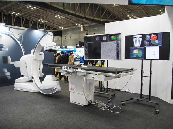 製品展示においては, “Evolution, Innovation, Transformation ―solving challenges together―”が今回もスローガンとして掲げられ,少子高齢化という現状における医療現場の課題に対し,同社の発想や技術でいかに解決していくかを追究した製品群が紹介された。回診用X線撮影装置は,ITEM開催直前の4月9日(水)に発売された「MobileDaRt Evolution MX9 Version」を展示。セカンドモニタや3Dカメラ(オプション)などが効率的かつ安定した撮影を支援する。一般撮影システムは「RADspeed Pro SR5 Version」が展示され,新たにAIを活用したトモシンセシスアプリケーションが搭載されたことが紹介された。血管撮影システムのコーナーでは,昨年10月に発表された「Trinias series with SCORE Opera」向け音声認識機能「SMART Voice」をメインで展示し,カテーテル治療の効率化や医療従事者の負担軽減に寄与することをアピール。X線TVシステムは「SONIALVISION G4 LX edition」が展示され,より安全な手技をサポートする新技術などがアピールされた。
