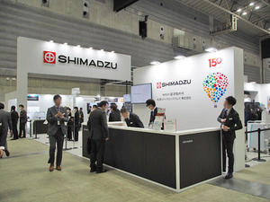 島津製作所の創業者である島津源蔵氏が,京都木屋町二条南で教育用理化器械製造を開始したのは1875年(明治8年)のことである。その後,同社は日本初の医療用X線装置や,世界初の遠隔操作式X線テレビジョン装置を開発するなど,医療分野はもとより分析・計測機器や産業機器,航空関連機器など幅広い分野で新技術を創出し続けてきた。今年3月には創業から150周年を迎え,今回のITEMでは,150周年を大々的に打ち出したブースを出展した。ブース壁面には,「150 YEARS ANNIVERSARY」と大きく記載されたほか,カラフルな気球のイラストが描かれた。これは,当時,欧米で盛んに研究されていた軽気球を,外国人の手を借りずに京都で作成し,理化教育に対する府民の関心をいっそう高めるとともに,東京奠都(てんと:新たに都を定めること)によって沈み込んでいた京都の町を活気づけたいという京都府からの依頼によって,同社が軽気球を製作し,1877年に民間初の有人での飛場に成功したという出来事に由来する。同社は,このエピソードを150周年記念アニメーションとしてYouTubeで公開しているほか,ブース正面のモニタでも上映した。また,ブース正面には,150周年記念企画の一つとして,同社のデザイン部門が京都の伝統工芸作家とコラボレーションした回診用X線撮影装置のコンセプトモデルが展示され,来場者の関心を集めた。