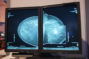 バルコは,マンモグラフィ用モニタのパイオニアとして高いシェアを誇り,現在4製品をラインナップしている。なかでも,RSNA2011で発表したマンモ専用モニタ「Coronis Mammo Tomosynthesis 5MP」は,マンモグラフィでトモシンセシス撮影を行う件数が増加していることを受け,トモシンセシスに適した性能,機能を搭載している。一般的な5MPマンモグラフィは,最大輝度が800 cd/m2,常用でのDICOM規格キャリブレーション輝度は600 cd/m2程度のものが多いが,Coronis Mammo Tomosynthesis 5MPは,最大輝度2100 cd/m2,常用1000 cd/m2と非常に明るいため,細かい石灰化の描出やデンスブレストの観察に有用である。非常に高い輝度を生かして,シャウカステンとしても利用でき,デジタルとフィルムとの比較が容易に行える。また,画面の均一性を正確にするため,ピクセルごとに補正し,微細な病変の描出にも優れている。また,マンモグラフィはデータ容量が非常に大きいため,反応速度を上げて,滑らかな画像表示を可能にした。