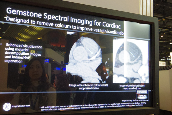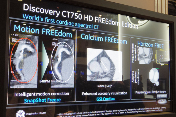 一方で,Discovery CT750 HD FREEdom Editionの臨床評価では,日本の東京女子医科大学病院の症例画像が紹介されていた。同装置は,RSNA2011で発表されて以降,2012年4月に日本国内でも正式にリリースされた。“Motion FREEdom, Calcium FREEdom, Horizon FREE”をコンセプトに,フラッグシップ機の「Discovery CT750 HD」の心臓撮影機能を強化。動きによるモーションアーチファクトを抑える“SnapShot Freeze”,冠動脈の石灰化を分離し,石灰化によるアーチファクトを低減する"GSI"を初めて搭載するなど,最先端の技術が投入されている。