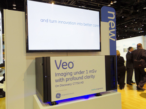 GE HealthcareのCTブースでは,「Discovery CT750 HD FREEdom Edition」「Optima CT660 FD」の装置本体,CT画像再構成技術「Veo」のサーバを展示した。ブース内ではVeoやASiRなどの技術により,被ばく低減のリーダーシップ役を果たすGEの取り組みと,昨年のRSNA2011で発表した,Discovery CT750 HD FREEdom Editionの臨床での評価について,症例画像を用いて紹介していた。