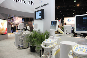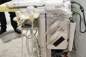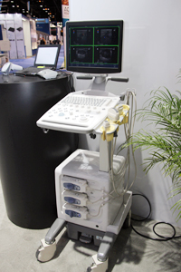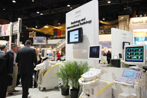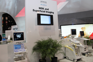 2011年4月に超音波事業を日立アロカメディカルに統合してから約1年半が経過した。統合により超音波装置が拡充し,領域や目的など,顧客の希望に細かく対応可能な提案の幅が広がっている。ブースでは,領域別に各クラスの装置が配置され,要望への対応力が来場者にわかりやすい展示となっている。