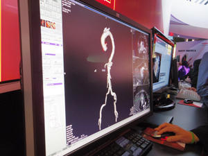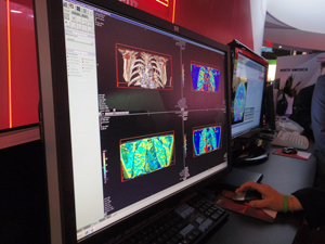 RSNA2012の東芝の展示では,新しいアプリケーションとして,動脈弁狭窄症の人工弁置換術を支援する「TAVR(Transcatheter Aortic Value Replacement)」(日本国内薬事未承認)を紹介した。ワークステーション上のメニューからTAVRを選択するだけで,病変部を描出するほか,計測なども容易に行える。また,肺気腫の定量化,可視化を行う「Lung Density Analysis」(日本国内薬事未承認)についても,デモンストレーションを行った。