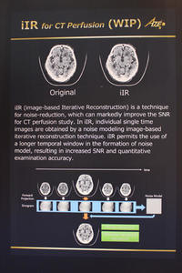 iIR(image-based Iterative Reconstruction)は,従来はCT本体でしか実行することができなかった逐次近似再構成を,ワークステーション側で応用する技術である。CTからワークステーションに取り込んだ画像データを順投影によりサイノグラムデータに戻し,その投影データに逐次近似画像再構成を応用して画像を再構成し直すという方法で,ノイズの少ない画像をポストプロセスで取得することができる。撮影画像のノイズを低減できるようになるため,撮影時の被ばく線量低減に貢献する。まずは被ばく線量が多いとされるCT Perfusionへの適応から開発が進められている。