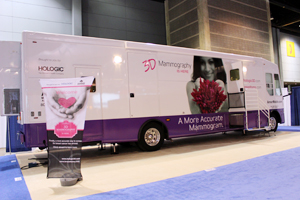展示ブース並びには,Selenia Dimensionsを大型車に搭載した検査車を展示。また,ワークショップブース(Booth 1152)では,トモシンセシス/C-View読影とトモバイオプシーのワークショップを12月1〜4日まで開催。事前の募集枠は早々に満席となったため,講義パートのみ追加で傍聴を受け付けるなど,盛況を博した。